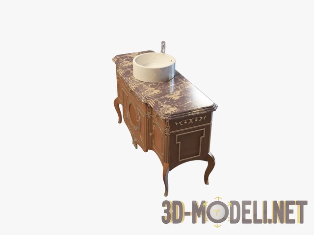 3D модель резной тумбы с мраморной столешницей. Изящная тумба с накладным умывальником. Сочетание гнутых ножек и мраморной столешницы делает такую тумбочку предпочтительным элементом в классическом дизайне ванной комнаты.