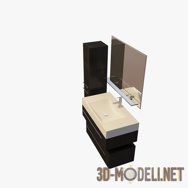 3D модель двойной тумбы с прямоугольным умывальником, узкого шкафа и зеркала простой формы, с полочкой для аксессуаров и различных принадлежностей, необходимых в ванной комнате.