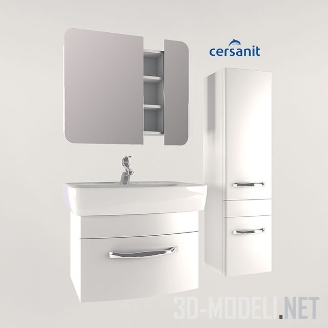 Набор современной мебели для ванной комнаты от бренда Cersanit, серия Pure. В комплекте тумба с паковиной и смесителем и пенал. Фасады мебели могут быть белыми или под дерево. Текстура есть.