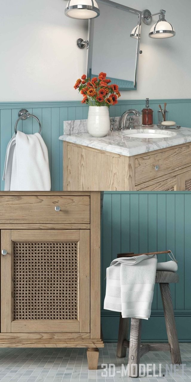 Набор предметов мебели и аксессуаров для ванной комнаты, от бренда Pottery Barn. В комплекте умывальник Sausalito Single Sink Console, зеркало Kensington Pivot Rectangular Mirror, настенная лампа PB Classic Sconce - Milk Glass. Фон в сцене отсутствует.