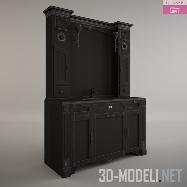 Шикарная мойка для классического интерьера, модель BMT ZAR. Раковина с золотым краном врезана в темную столешницу, над столешницей между двух инкрустированных золотом светло-бежевых колонн - большое зеркало и два белых с золотом светильника. Под мойкой расположена тумба с ящиками и дверцами тоже светло-бежевого цвета с золотой инкрустацией. Размеры: 158 х 59 201.