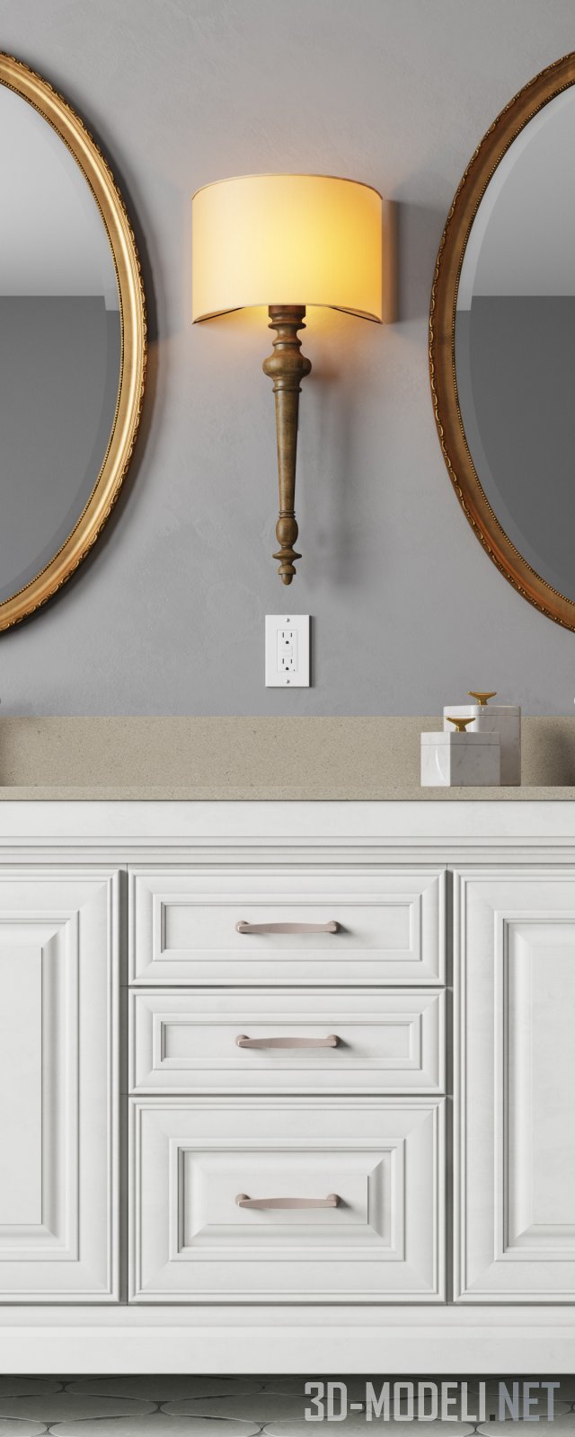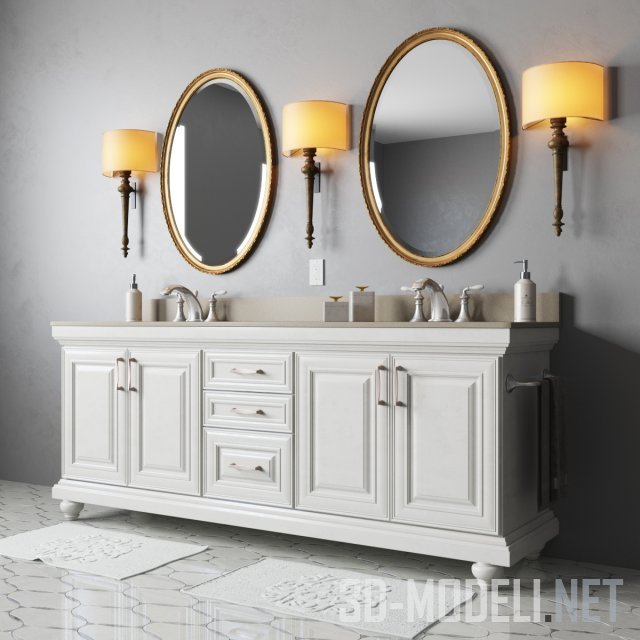 Красивая белая деревянная тумба Woodmark для интерьера ванной комнаты в классическом стиле. Ее размеры: 915 х 2200 х 560 мм. На тумбе раковины Kohler Devonshire, краны Kohler и аксессуары от West elm. Над тумбой висят два зеркала Kensington в овальных рамах. Между ними будут хорошо смотреться настенные светильники с основанием из античной латуни. На полу плитка Beau Monde и коврики.