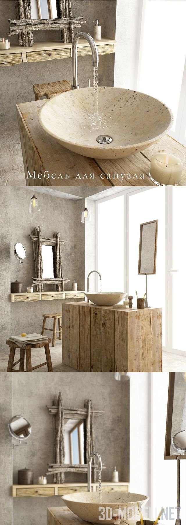 Рустикальная ванная комната. Набор с высокой дощатой мойкой прямоугольной формы, на которой стоит небольшая раковина и прикреплено зеркало в простой деревянной раме. Деревянные табуреты и зеркало на стене в круглой раме из скрепленных между собой сучьев идеально вписываются в стилистику комплекта.