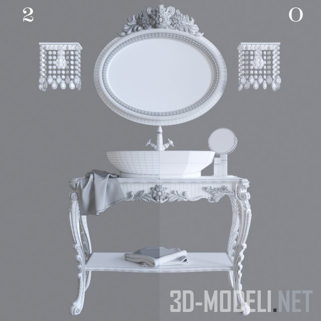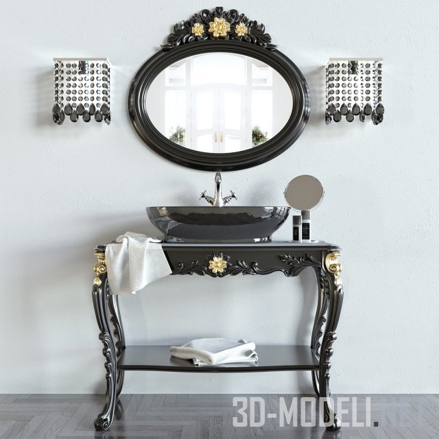 Мебельный набор для ванной комнаты, от итальянского производителя Maison Ego. В комплекте изящная тумбочка с накладной раковиной и смесителем, зеркало в декоративной раме, настенные светильники с хрустальными подвесками и декоративные элементы (полотенца, настольное увеличительное зеркало, косметические средства). Мебель смотрится одинаково эффектно как в белом, так и черном цвете отделки.