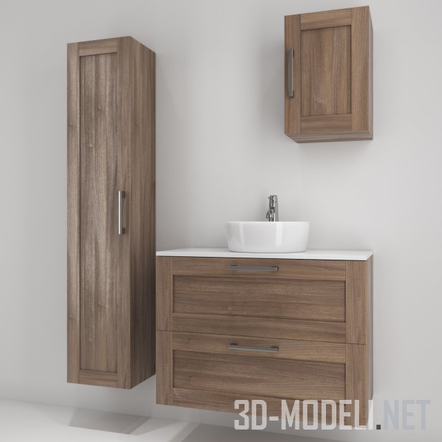 Комплект мебели для современного санузла, серия Gordomon от производителя IKEA. В наборе консольная тумба с двумя ящиками, пенал и шкафчик. Белого цвета столешница и накладная раковина отлично гармонируют с деревянной отделкой мебели.