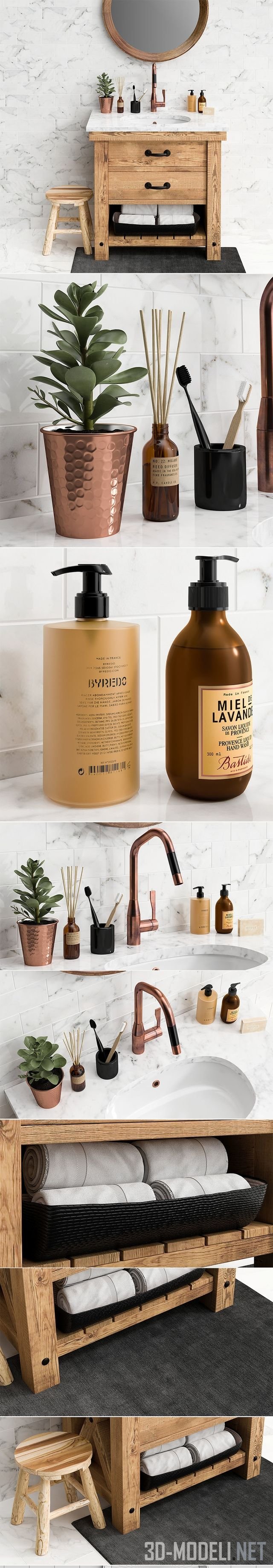 Набор для интерьера ванной комнаты. В основе сета тумба Benchwright Sink Console от Pottery Barn, изготовленная из сильно состаренной древесины, которая намекает на богатое индустриальное прошлое. Тумба отделана красивым глянцевым каррарским мрамором и имеет фаски с каждой стороны.