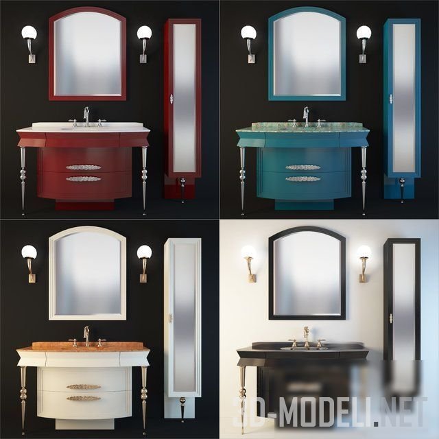 Зеркало, бра, пенал и тумба со встроенным умывальником Eurodesign FASHION для современной ванной в классическом стиле. Корпуса мебели представлены в четырех цветах (черном, винно–красном, белом, и сине–зеленом). Столешницы – вариации мрамора. Декоративные элементы комплектов: металлические точеные ножки, витиеватые накладки под ручками, смеситель в стиле ретро. Бра со стеклянными шарами–плафонами на металлических консольных основаниях.