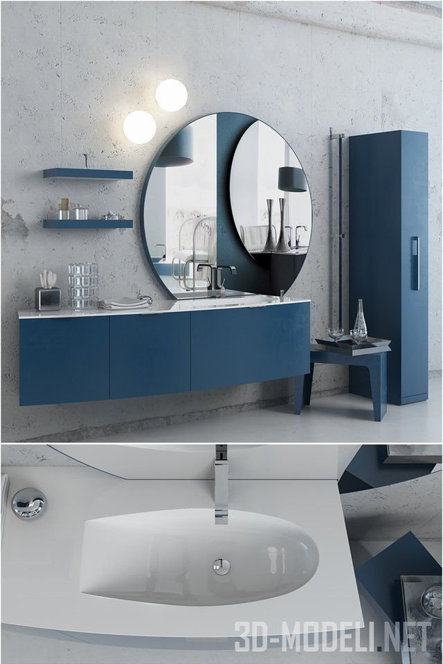 Комплект современной мебели для ванной из коллекции Maori от Cerasa, минималистичный вертикальный полотенцесушитель от Margaroli, смеситель Gessi (из коллекции Rettangolo XL). В составе гарнитура: большое круглое зеркало (d145см), навесная тумба с полками, лаконичный пенал, табурет, шаровидные бра. Мебель выполнена в сочетании серо-голубых поверхностей, белой столешницы и хромированных элементов.