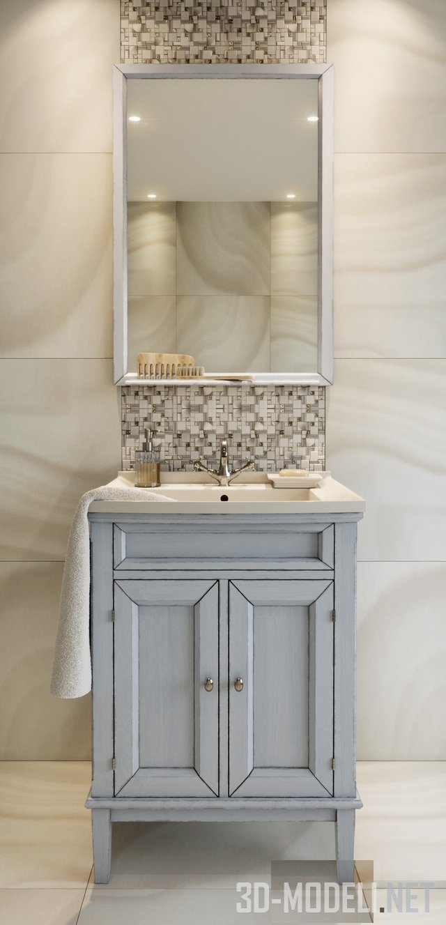 Современный комплект (тумба CAPRIGO из коллекции JARDIN, смеситель, раковина, зеркало) для ванной в стиле Прованс. Габарит тумбы: 61х87,6х49см. Две створки и верхняя горизонтальная панель на фасаде - выполнены в виде рустикальных рамок с наполнением. Цвет тумбы - грязно-белый, с царапинами и потертостями. Нежно-кремовая раковина с винтажным латунным смесителем, мыльницей и стеклянным диспенсером, полотенце, деревянные щетка и расческа, простое прямоугольное зеркало в деревянной рамке «под тумбу», создают аутентичный комплект в ванную комнату.