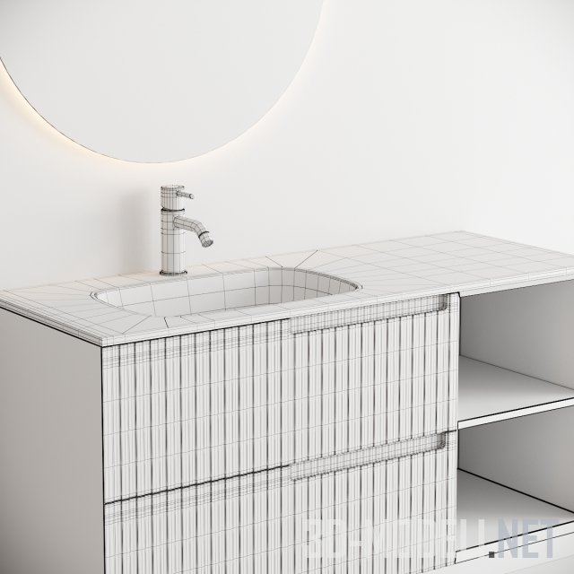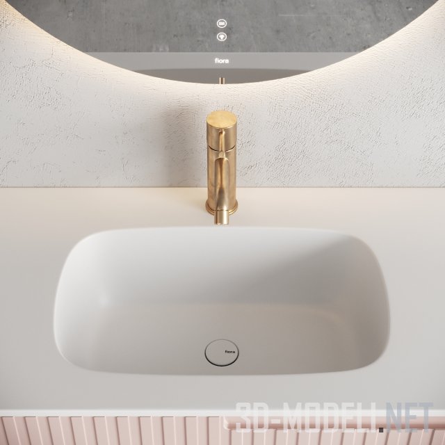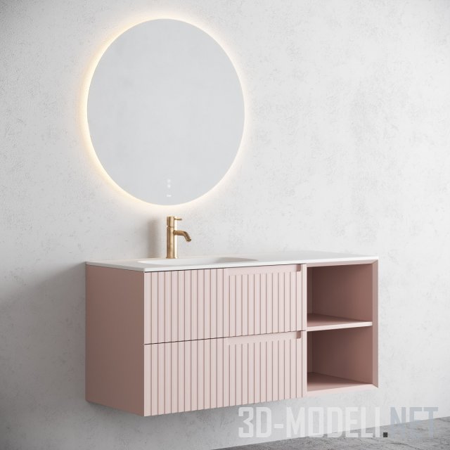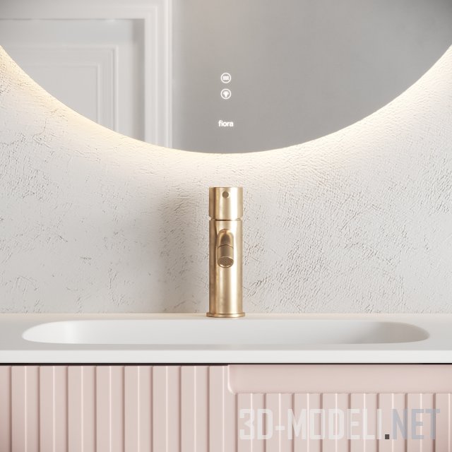 Комплект для ванной из коллекции Synergy с навесной тумбой Fiora, круглым зеркалом с контражурной подсветкой и золотистым смесителем на встроенной в белую столешницу раковине. Тумба - с двумя выдвижными ящиками и парой открытых полок. Фасады ящиков декорированы вертикальными барельефными полосками. Цвет тумбы - нежно-нюдовый. Габарит: 120х46см.