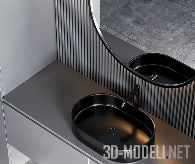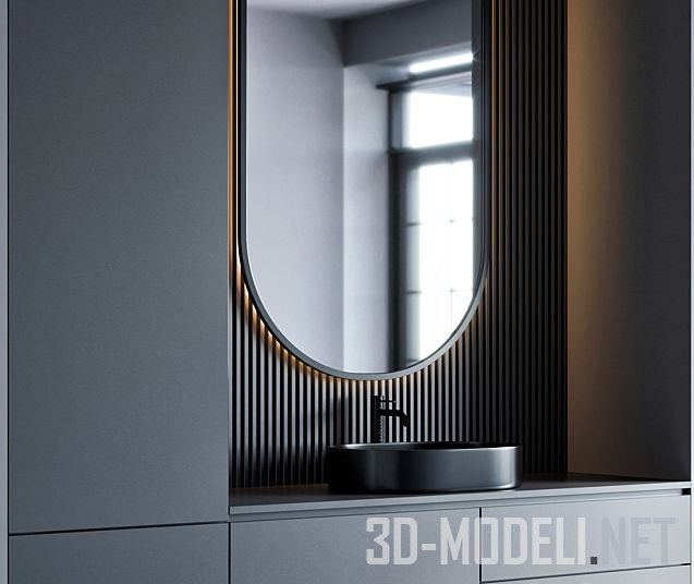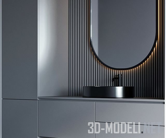 Элегантный дизайн и современные линии отличают этот мебельный сет для интерьера ванной комнаты. Фасады консольной тумбы и шкафа имеют красивый оттенок, который гармонично сочетается с темной реечной отделкой стены. Вертикальное зеркало имеет закругленные углы и оснащено подсветкой. Накладная раковина черного цвета и смеситель от Gessi идеально дополняют мебель.