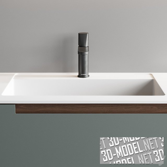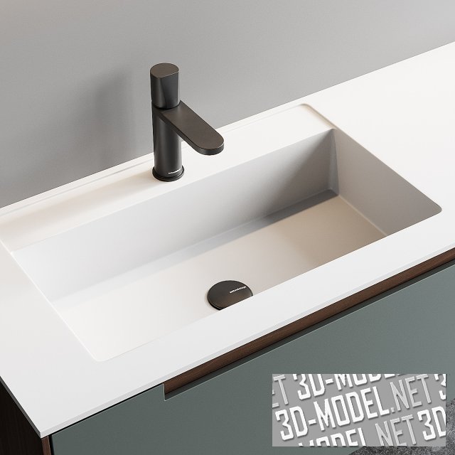 Современная мебель для интерьера ванной комнаты из коллекции Orma от производителя antoniolupi. В наборе настенная тумба прямоугольной формы, дизайн разработал Nevio Tellatin (размеры тумбы: ширина 1374 м, глубина 470 мм, высота 375 мм), со встроенным умывальником Flumood от Mario Ferrarini. Размеры умывальника: ширина 1374 м, глубина 470 мм, высота 150 мм. Матовый смеситель из коллекции Indigo Type от Nevio Tellatin и большое прямоугольное зеркало (1350 х 25 х 750 мм) идеально дополняют сет.