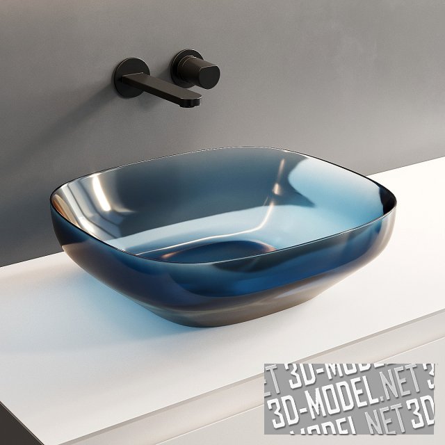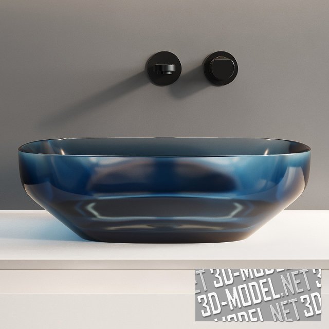 Современный минималистичный комплект мебели для интерьера ванной комнаты с белой подвесной тумбой (144х54х37,5см) из коллекции Panta Rei от Antonio Lupi. Накладная раковина Borghi от gum design (60х40х17,5см) из темно-синего Cristalmood® и встроенный в стену двухпозиционный смеситель с черной отделкой являются эффектным акцентом комплекта. А горизонтальное зеркало от AL Studio (144х75х2,5см) с подсветкой по периметру, повторяя ширину тумбы создают отличный гармоничный ансамбль.