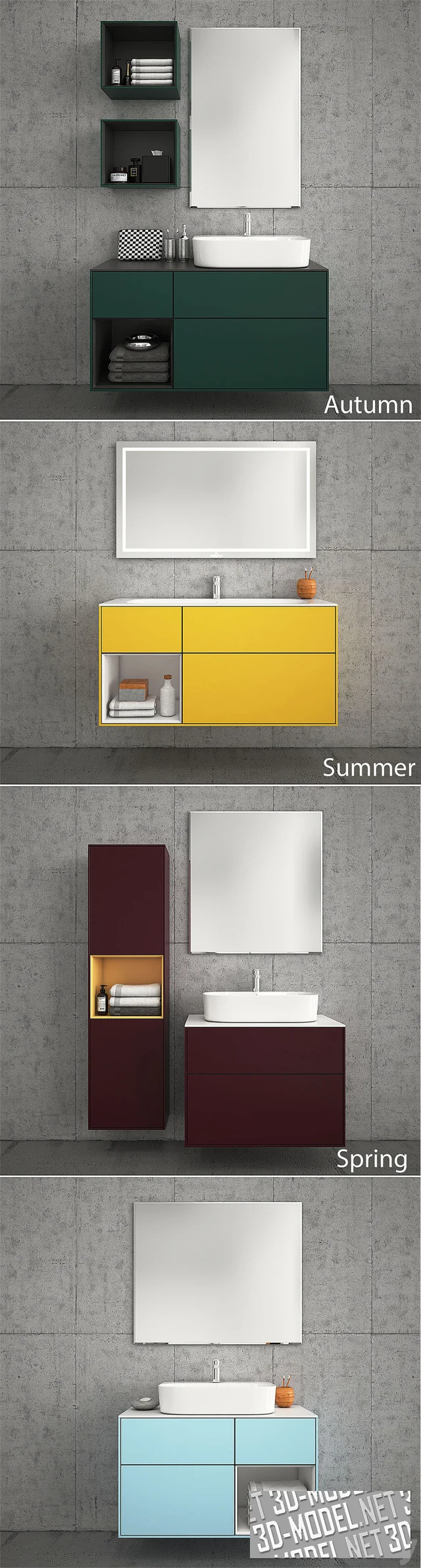 Небольшая коллекция умывальников, навесных тумб, шкафов и полок Finion, ванна и настенные зеркала. Полки заполнены аксессуарами – сложенными полотенцами, бутылками с косметикой и средствами по уходу за телом. Смесители Villeroy & Boch серии JUST, хромированные. Корпуса и фасады мебели выполнены из плит ярких цветов: желтого, бледно-голубого, бордового и темно-зеленого цветов.