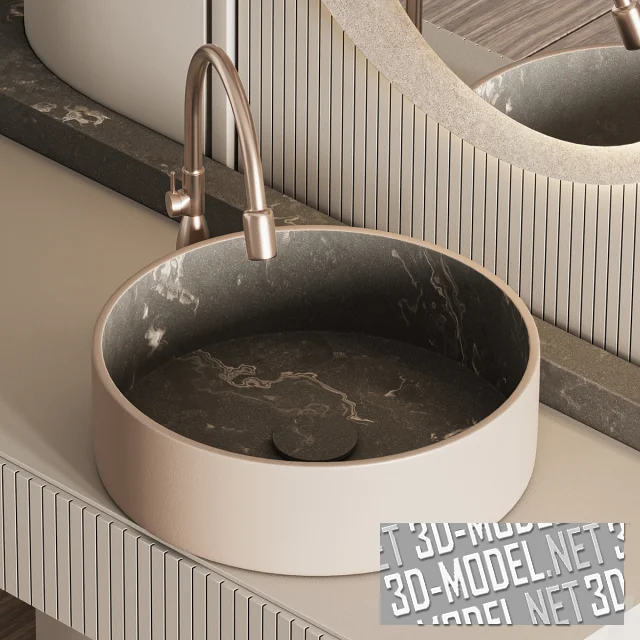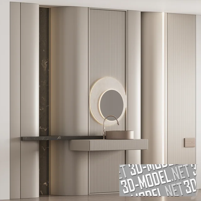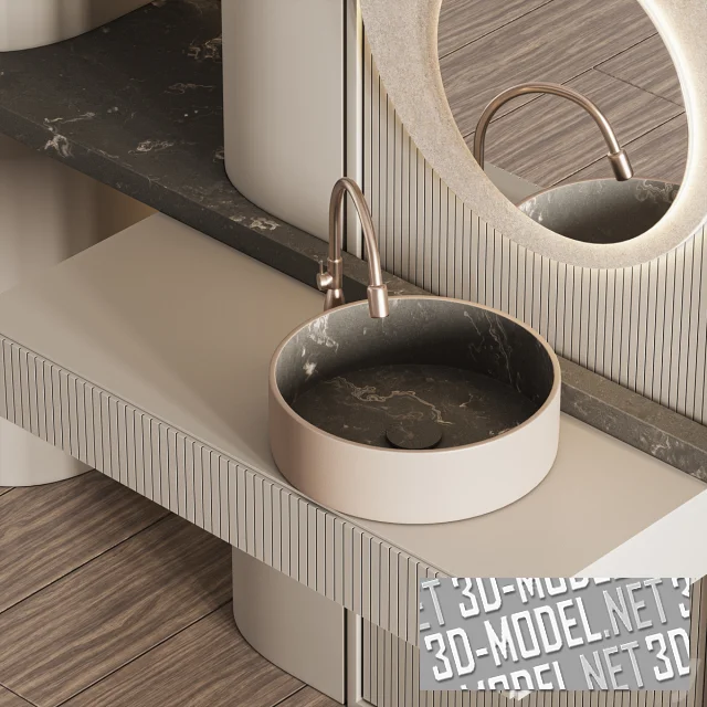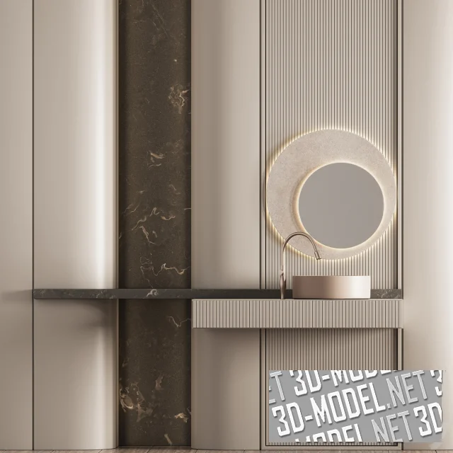 Декор стены, навесная тумба, накладная раковина, смеситель и круглое зеркало в наборе для современной ванной комнаты, в сочетании жемчужно-бежевого и темно-коричневого мрамора. Стена декорирована реечными панелями, скругленными на гранях полуколоннами и вертикальной вставкой из мрамора в нише. В этих же цветах и материалах отделаны навесная тумба и мраморная столешница.