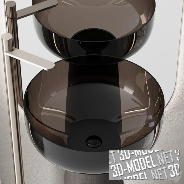 Второй комплект: напольный черный бокаловидный умывальник (с круглой стеклянной тонированной раковиной и черной матовой опорой, сужающейся кверху) с напольным серебристым смесителем; арочный фрагмент стены с отделкой белой рельефной штукатуркой и овальным вертикальным зеркалом со скрытой подсветкой по периметру.