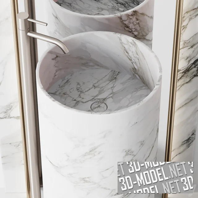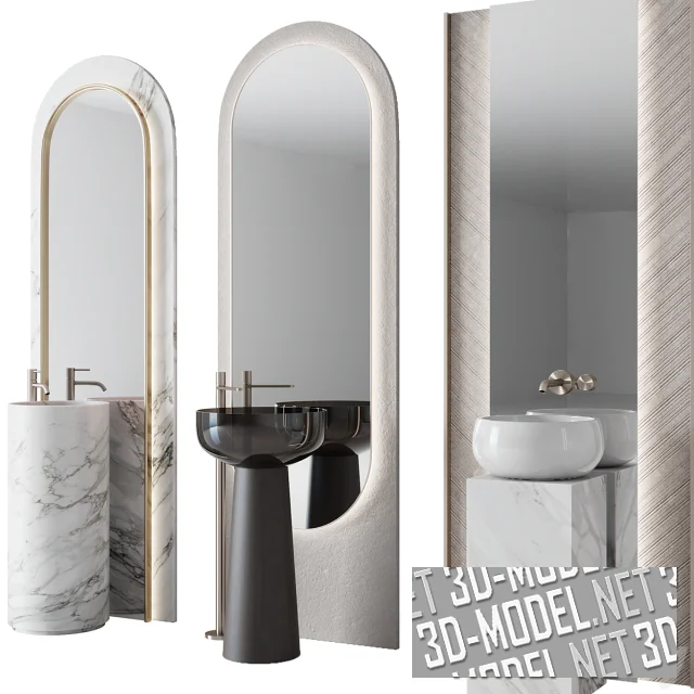 Три варианта современных умывальников с зеркалами и смесителями. Первый комплект: арочное зеркало от пола в обрамлении из золотистого металла и белого с черными прожилками мрамора и скрытой подсветкой; напольный цилиндрический умывальник из белого мрамора с черными прожилками; напольный серебристый смеситель.