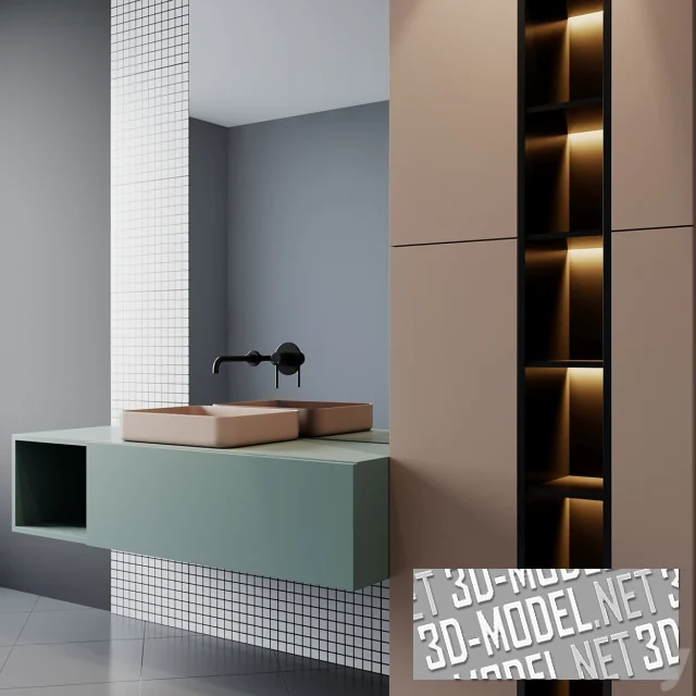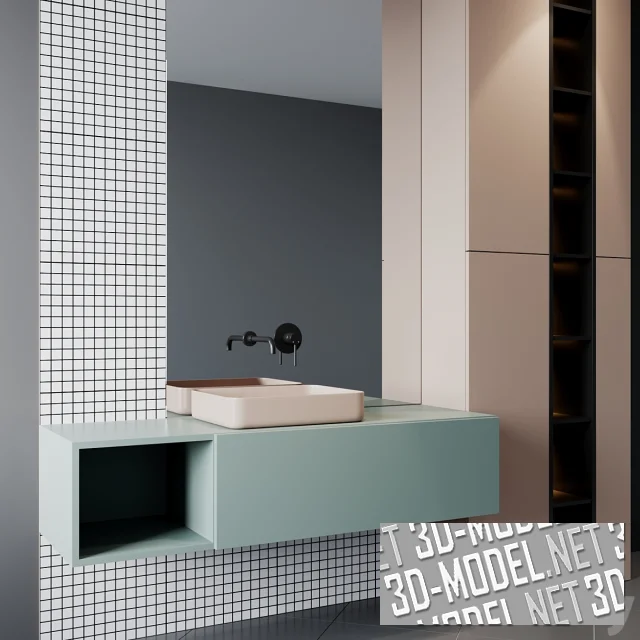 Фрагмент современного санузла с отделкой из мелкой белой квадратной плитки с черными швами. На стене смонтирована подвесная светло-бирюзовая тумба с накладной квадратной раковиной бежевого цвета. Над тумбой с открытой секцией и большим выдвижным ящиком с глухим фасадом без ручки смонтировано большое вертикальное зеркало. Над раковиной, в плоскость зеркала врезаны излив смесителя и ручка регулировки воды. Справа от умывальника смонтирован большой бежевый шкаф на всю высоту с вставкой-пеналом с открытыми полками со светодиодной подсветкой.