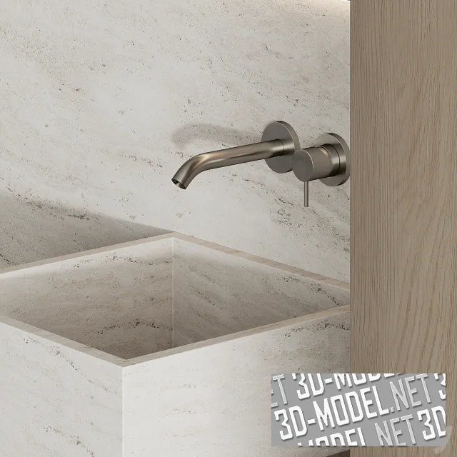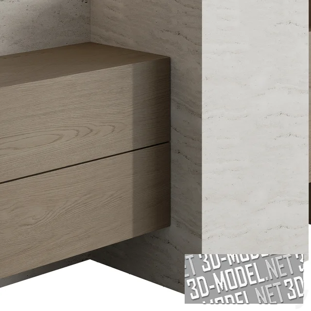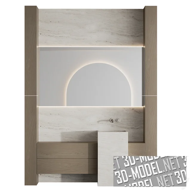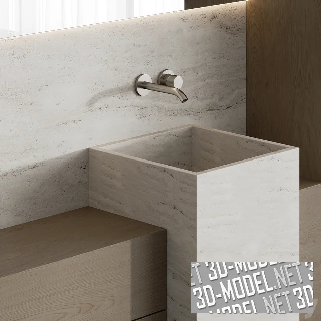 Фрагмент современной ванной комнаты в стиле минималистичного конструктивизма, с квадратной каменной раковиной умывальника, встроенным в стену серебристым смесителем и большим зеркалом со скрытой подсветкой горизонтальных кромок. Ниша с умывальником и зеркалом ограничена по бокам высокими пилонами из материала с текстурой дерева. Из этого же материала изготовлена навесная асимметричная тумба, смонтированная слева и справа от тумбы умывальника. В левой (более широкой) части тумбы обустроены два выдвижных ящика. Задняя стенка образовавшейся ниши отделана тем же светло-серым камнем, из которого изготовлена тумба с раковиной.