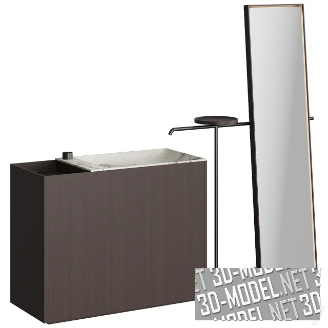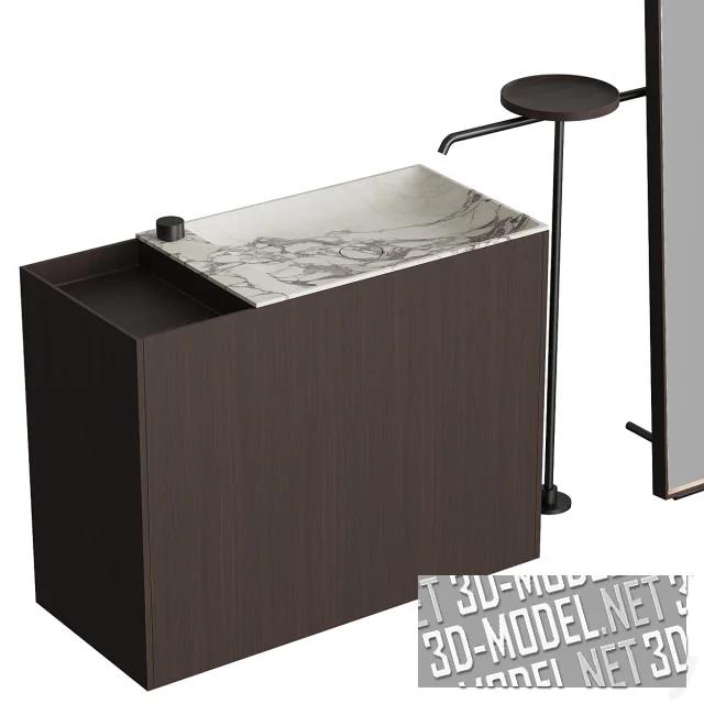 Минималистичный современный набор для ванной (умывальник, смесители и напольное зеркало) Falper MA от Foster + Partners. Представлено две конфигурации: тумба венге с умывальником, черным напольным смесителем и напольным вертикальным зеркалом в рамке и светлая тумба с темной мраморной раковиной и смесителем, встроенным в стену.