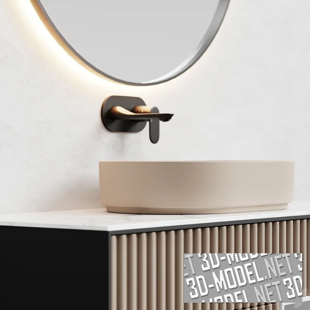 Современное наполнение зоны умывальника в минималистичной ванной комнате от Ceramica Cielo. В наборе навесная тумба с рельефными фасадами, накладная овальная бежевая раковина, смеситель настенного монтажа с овальной планкой (темная бронза), круглое настенное зеркало в тонкой черной рамке с подсветкой по периметру. Габарит подвесной тумбы: 135х50х43см. Корпус тумбы - черного цвета, с бежевыми фасадами на трех выдвижных ящиках (четвертая ячейка - ниша с белой отделкой) и белой столешницей с текстурой мрамора.