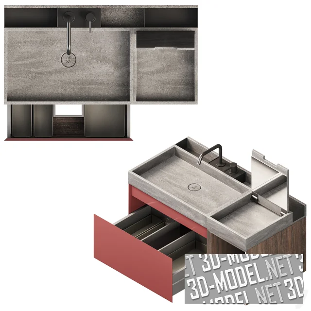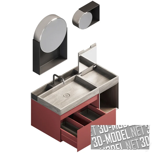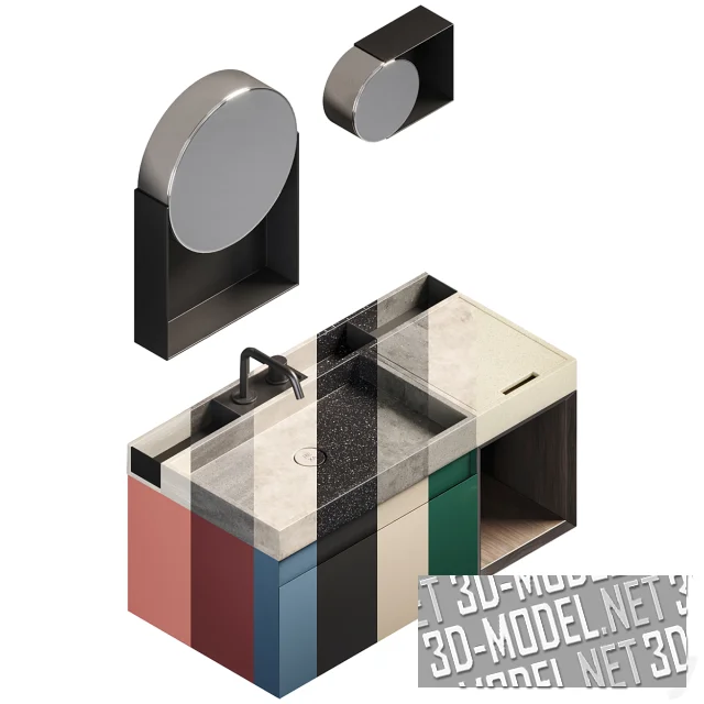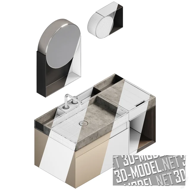 Monica Graffeo). В сете каменная прямоугольная раковина Eve 90 из Corian Dune Prima и Corian Neutral Concrete (90х46х8см, 14 вариантов текстуры) с добавленной секцией из материала раковины с местом хранения под крышкой с зеркалом; смеситель из темного металла; навесная тумба с выдвижным ящиком под раковину (матовый лак, 16 цветов, габарит: 60х46х36см); навесная тумба под дополнительную секцию (цвет дуб Бруно, габарит: 30х46х36см).