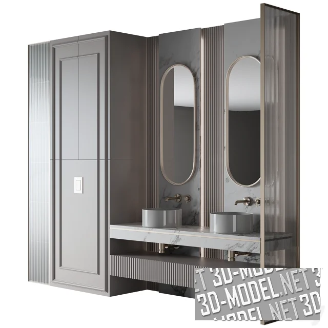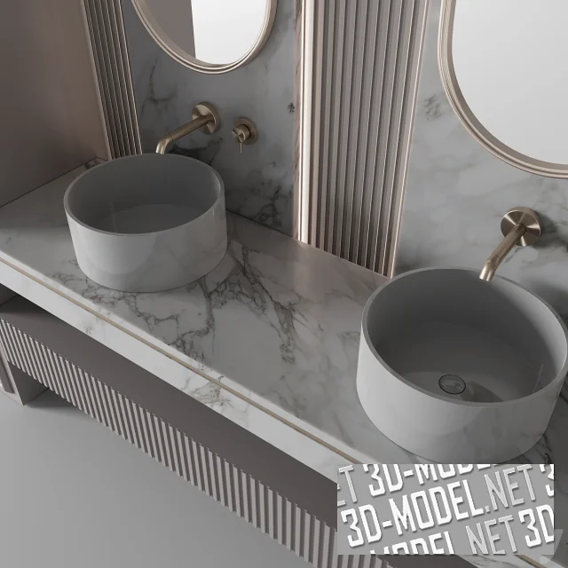 Справа от простенка - широкая ниша с двумя вертикальными овальными зеркалами на стене, отделанной мрамором и вставками с вертикальными канавками. Под зеркалами на толстой столешнице из светлого мрамора смонтированы две круглые белые накладные раковины. Под столешницей навесная тумба с фасадами на выдвижных ящиках, декорированных вертикальными канавками из материала и в цвете стеновых вставок.