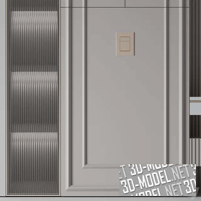 Фрагмент современной ванной комнаты с двухместным умывальником, местом для установки унитаза и пеналом с полупрозрачной гофрированной стеклянной створкой. Отделка и элементы подобраны в стиле нео-классика. Простенок с местом для установки унитаза отделан молдингом в виде рамки. Верхняя часть простенка - ниша, прикрытая двумя створками. В плоскость простенка вмонтирована кнопка слива на прямоугольной раме.