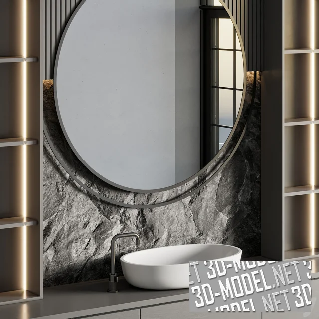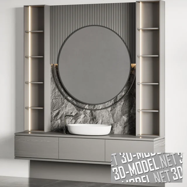 Набор современной мебели и аксессуаров для санузла. На декорированной рельефной стене висит круглое зеркало. По бокам – вместительные полки для хранения банных принадлежностей. Белая раковина и серая навесная тумба составляют гармоничный тандем. Сочетание дерева и камня создает стильный дизайн.