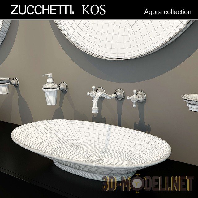 Раковина и аксессуары от бренда Zucchetti, Agora collection. Артикул раковины: 7AG1BI. В комплекте также присутствует смеситель (Zucchetti collection Agora Tap art: ZAG672 - R99504), набор аксессуаров для ванной комнаты (Zucchetti collection Agora Accessories art: ZAD425; ZAD415; ZAD413; ZAD410 и зеркало KOS art: 8MP910BI