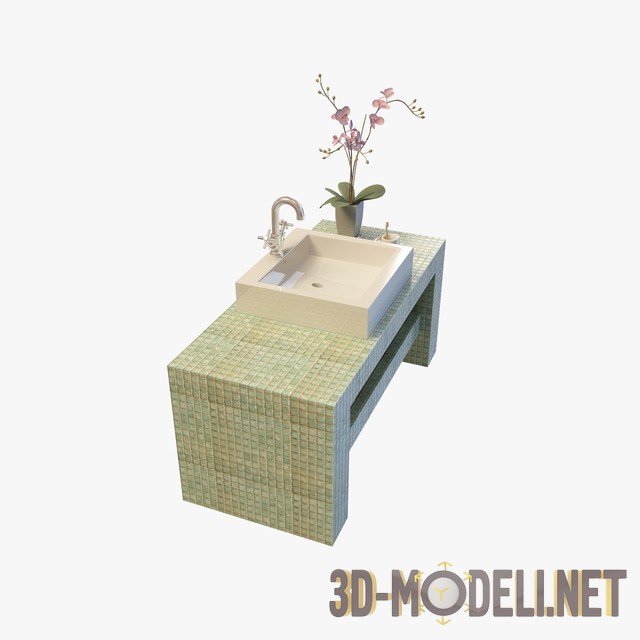 3d-модель квадратного умывальника, установленного на отделанной мозаикой тумбе. Нежное сочетание бледно-зеленой плитки и бежевой раковины создает очень свежий, милый дизайн. Который со своей стороны усиливает ароматом букет розовых орхидей.