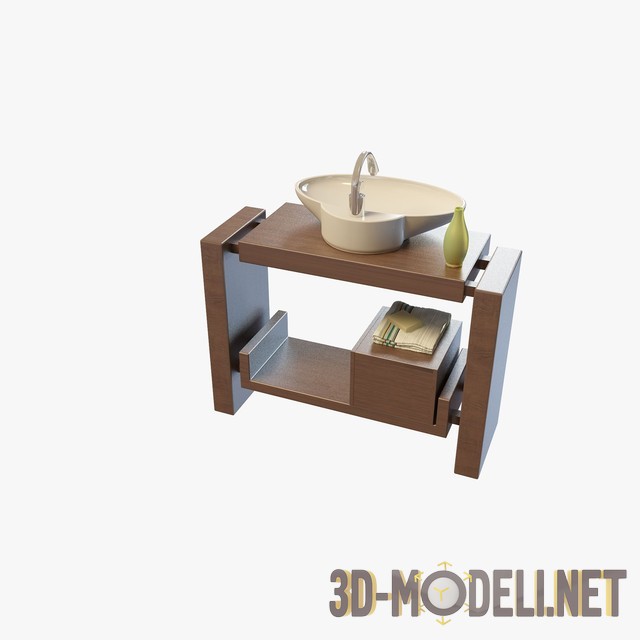 3D-модель овальной раковины, установленной на сквозной деревянной тумбе. По сути, тумба представляет собой столешницу с полкой и ящиками, которая смотрится легко и изящно. Реалистичности добавляют аксессуары для ванной комнаты.