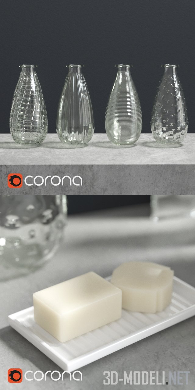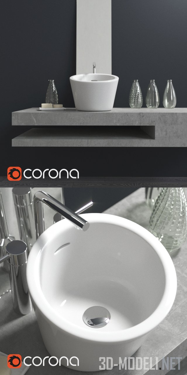 Вариант для современной ванной комнаты, накладная раковина интересной формы, и аксессуары к ней. В наборе смеситель, мыло, емкости из стекла.