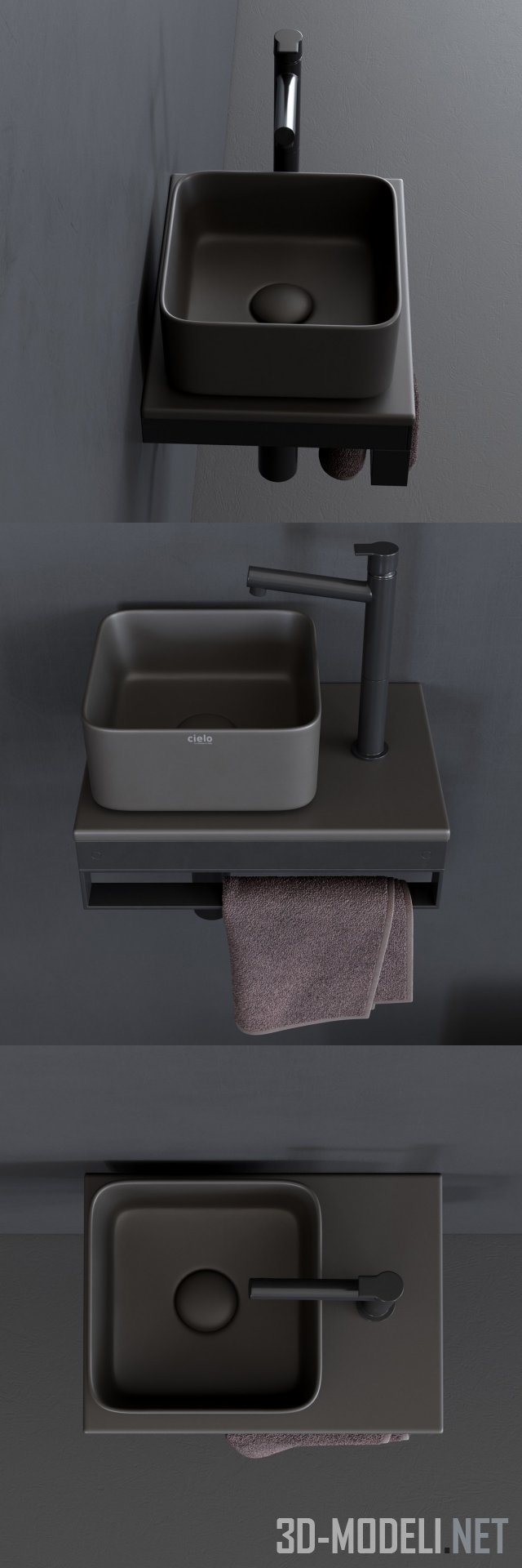 Квадратный керамический умывальник Milaq Square Ceramica Cielo Shui Comfort, дизайн Рaolo.D'Arrigo (2015 г). Раковина смонтирована на квадратную консольную столешницу, прикрепленную к стене. На столешнице высокий кран и полка. На полке висит махровое полотенце шоколадного цвета. Габаритные размеры прибора: