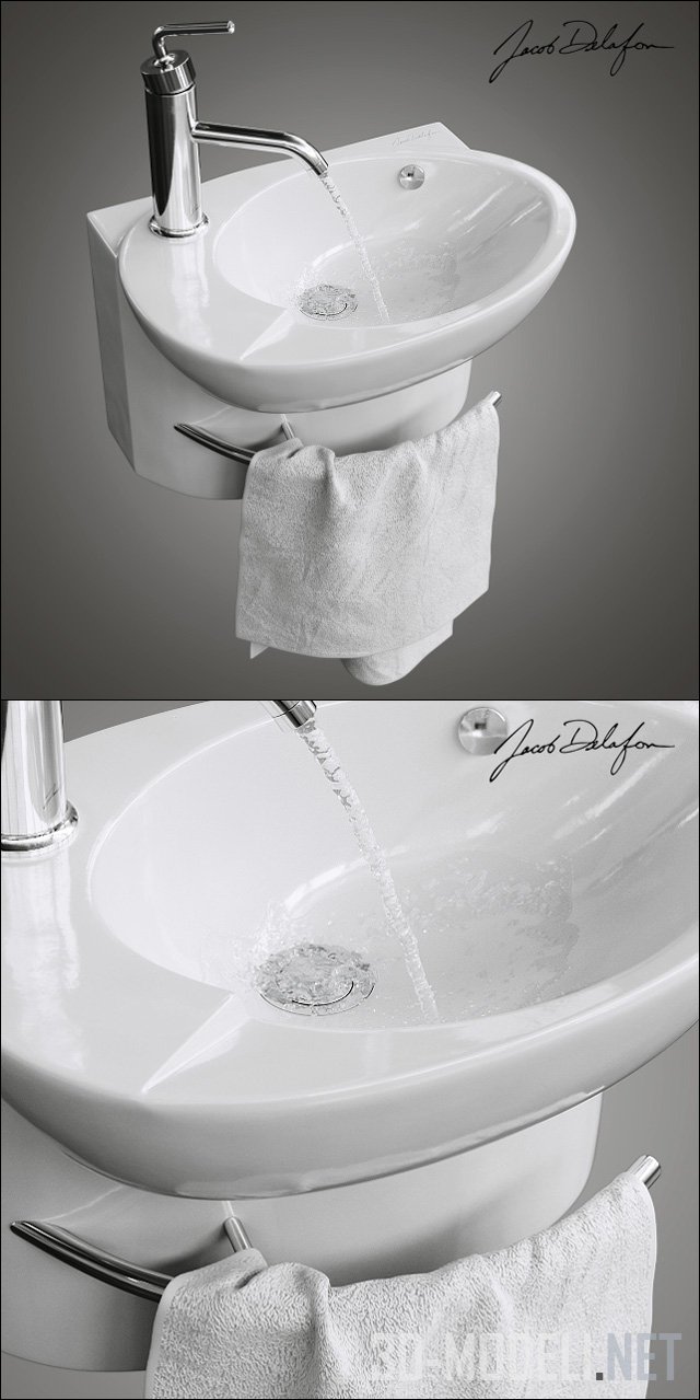 Комплект для элегантного интерьера ванной комнаты, содержит керамическую раковину Jacob Delafon Presquile (арт. E1337-00, размер 45 x 33,50 см) и смеситель Jacob Delafon Purist (арт. E14402-4A.). Бегущая струя воды из крана придает набору достоверность, как и висящее на специальном держателе белое полотенце для рук.