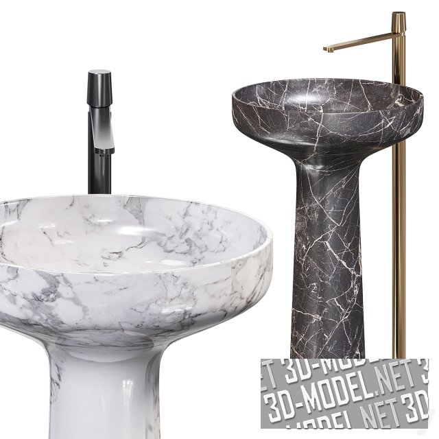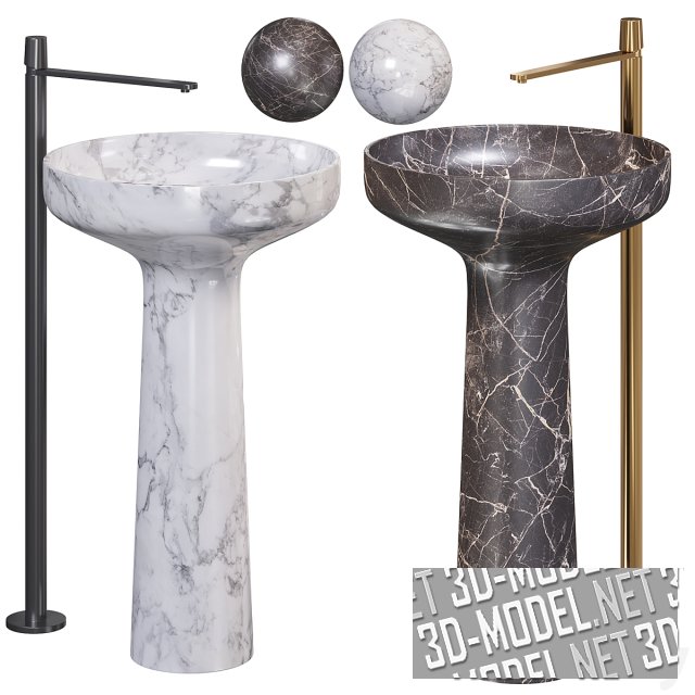 Современный отдельностоящий умывальник Indigo ND902GR от Antonio Lupi с напольными смесителями в минималистичном стиле. Представлено два варианта раковин в виде монолита из круглой чаши и цилиндрической опоры с плавным переходом: из белого мрамора с серой прожилкой и из черно-серого с белой. С белой раковиной установлен черный напольный смеситель. С черной раковиной - золотистый.