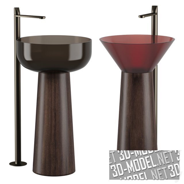 Современные напольные раковины ALBUME BOLO OAK и ALBUME CONO от Antonio Lupi Design с опорой из массива дуба и смесителями напольного монтажа. Представлены две строгие минималистичные модели: темно-красная, чуть просвечивающаяся коническая раковина (ALBUME CONO, d48/h20,5, h базы - 65,5см) и круглая, со скругленным дном темно-коричневая (ALBUME BOLO OAK, d48/h20,5, h базы - 65,5см). Раковины из материала  Cristalmood® смонтированы на массивных опорах из дуба, с темно-коричневой текстурой. Смесители с черной матовой отделкой.