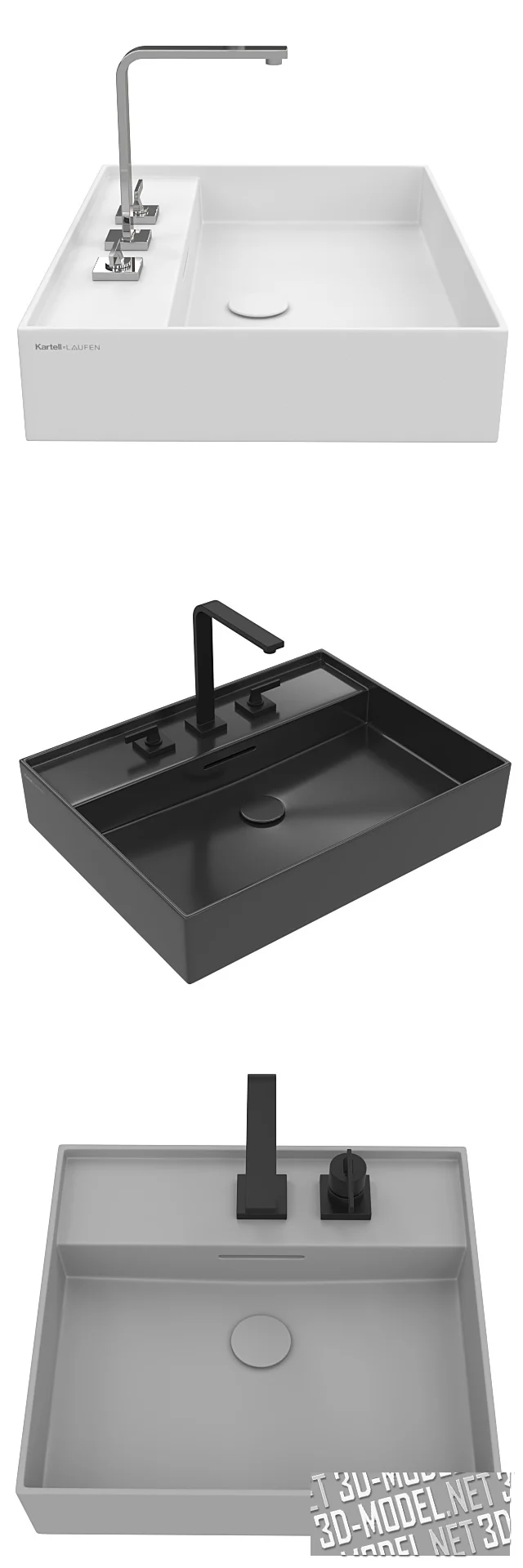 Прямоугольные современные раковины Laufen Kartell со смесителями Bongio Myamix 45501 (черный и хром), Bongio Myamix 46501 (черный и хром) и Grohe Mixer Eurocube 23446000 (хром). Раковины имеют немного утопленную площадку вдоль задней стороны, на которой монтируется смеситель. Раковины представлены в двух габаритах (60х46х12см и 50х46х12см) и в четырех цветах (белый глянец, белый мат, серый мат и черный глянец). На наружную боковую плоскость нанесен мелкий логотип.