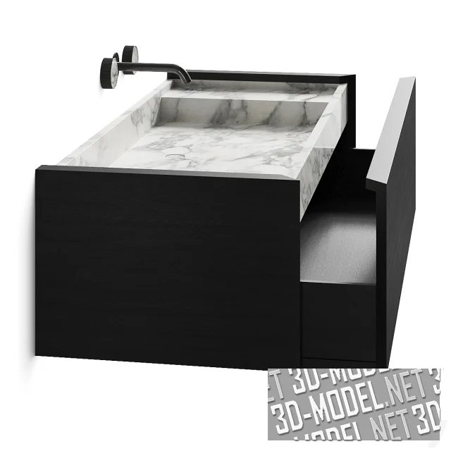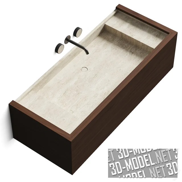 Современный прямоугольный умывальник Maami Home Navagio и навесная тумба Salvatori Spaghetti. Представлено два варианта декора комплектов: раковина из песочно-белого травертина с тумбой из массива ореха и белая с серыми прожилками мраморная раковина с черным массивом дерева. Умывальники укомплектованы встраиваемым в стену смесителем с круглыми, вынесенными по бокам от излива, ручками. Плоскости ручек смесителя дублируют декор материала раковины. Передняя плоскость тумбы является высоким фасадом выдвижного ящика, обустроенного под раковиной. Габарит умывальника: 120х50х35см.
