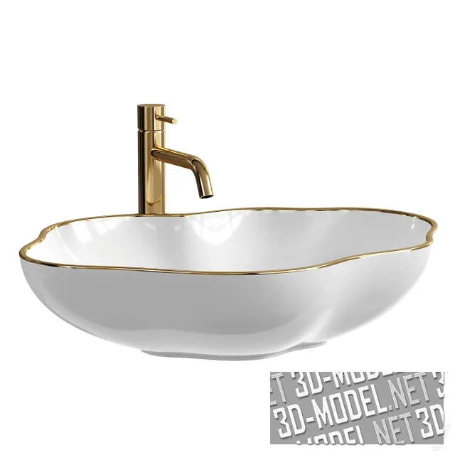 Белая с золотой каймой фигурная накладная раковина Pearl от REA и накладной однорычажный смеситель. Золотистой жемчужиной в этой морской раковине обозначена круглая выпуклая крышка сливного отверстия. Габарит раковины 51,5х37,5х13,5см.