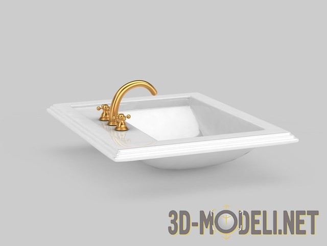 3D модель мойки в европейском стиле - прямоугольная форма из белоснежной керамики и золотое покрытие смесителя. Модель имеет реальные размеры, настроенные материалы и подготовлена для фотореалистичных интерьерных рендеров.