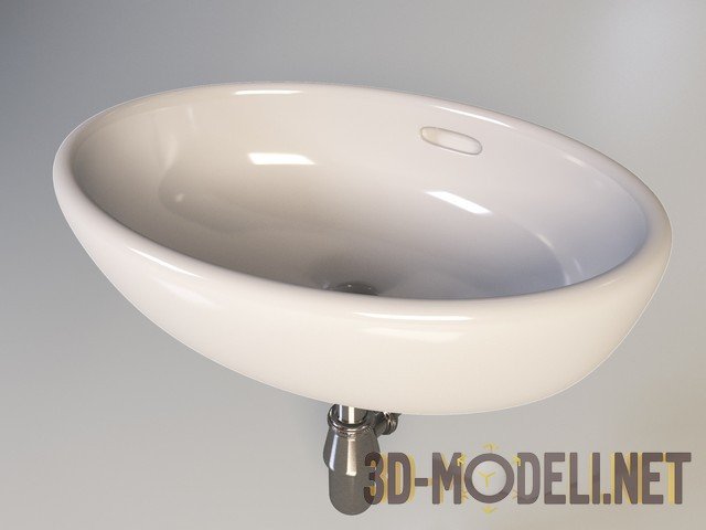 3d-модель современной раковины овальной формы, Palace от Laufen Pro, в комплекте с сифоном Hansgrohe 52053000. Такая раковина монтируется на столешницу, поставляется без отверстия для смесителя, с отверстием для перелива. Материал изготовления: керамика.