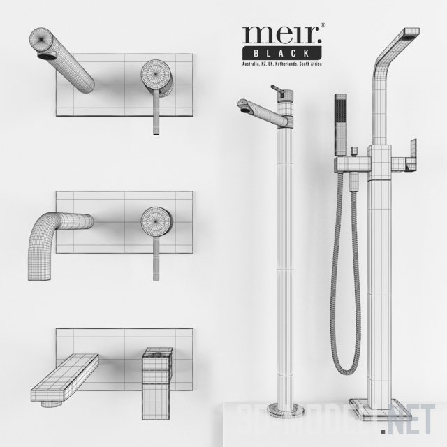 Набор невероятно стильных и красивых смесителей для ванной комнаты от компании Meir. В наборе круглый настенный комбинированный излив и смеситель (MC03), в матово-черной отделке, изогнутый матово-черный комбинированный излив и смеситель (MC05), квадратный настенный излив и смеситель (MC01), тоже матово-черный, круглый отдельно стоящий черный смеситель для ванны (MB05-R) и отдельно стоящий смеситель для ванны с ручным распылителем (MB08), также в отделке черным цветом и матовым покрытием.
