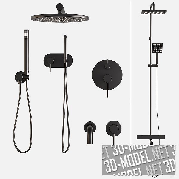 Набор современных смесителей FRAP с Aliexpress, черного цвета в минималистичном стиле. В коллекции: большая круглая лейка для душа, гигиенический душ, небольшая душевая лейка на гибком шланге, встраиваемый смеситель для душа, встраиваемый стеновой излив для рукомойника или ванны, душевая стойка со смесителем, большой стационарной квадратной лейкой и с лейкой поменьше на гибком шланге.