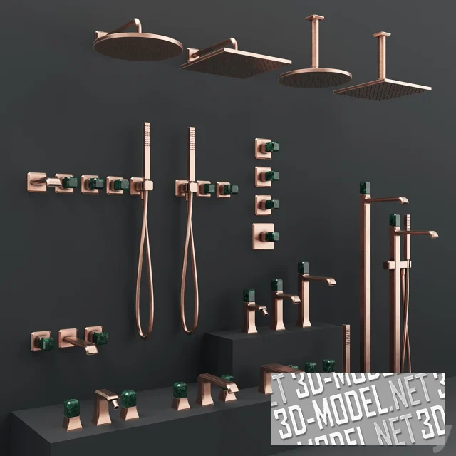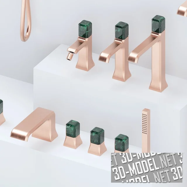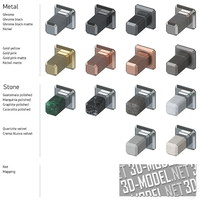 Основания смесителей представлены в восьми отделках: хром, темный хром, темный матовый хром, никель, желтое золото, розовое золото, розовое матовое золото, никель матовый. Ручки выполнены из вышеперечисленных металлов и 6 вариантов камня: черно-зеленый мрамор (Guatemala); черный с белыми прожилками мрамор (Marquina); серый с темными прожилками мрамор (Graphite); белый с темными прожилками мрамор (Calacatta); светло-серый кварцит (Quartzite velvet); светло-бежевый со светлыми прожилками мрамор (Crema Nuova velvet).