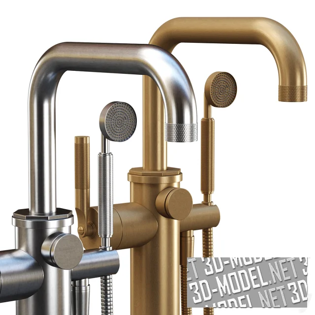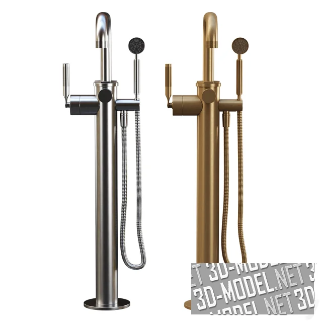 Современный напольный однорычажный смеситель для ванны, модель Samuel Heath. Стильный дизайн обеспечивает индустриальный, но в то же время минималистичный вид. Смеситель может быть сделан из хрома или латуни. Справа от излива закреплена небольшая душевая лейка на гибком шланге. Ручка лейки, рычажок смесителя и кромка излива декорированы мелкой «оружейной» насечкой.