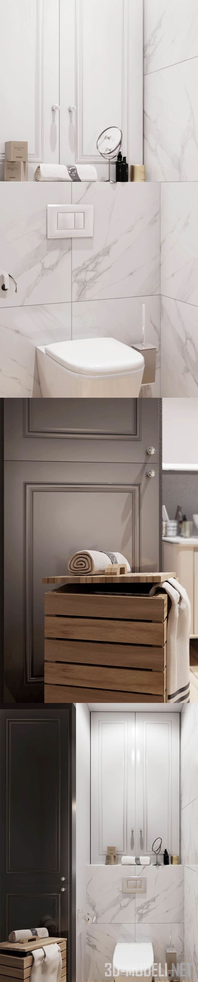 Туалетная комната со стенами, облицованными серо-белым мрамором. В помещении находятся: белый унитаз, кнопка слива на стене, зеркало, полотенце в деревянном ящике, свечи, ершик.