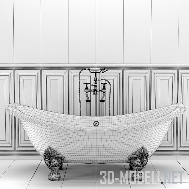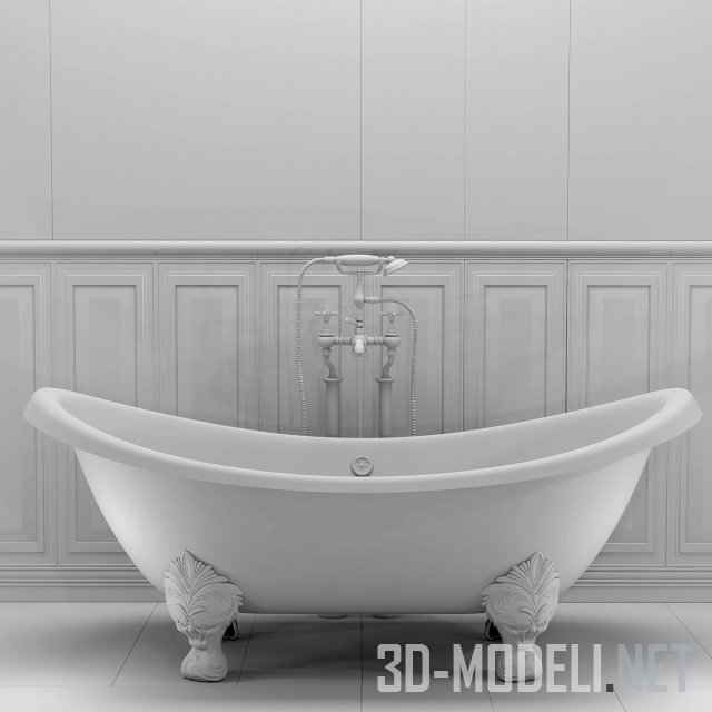 Идеальным решением для интерьера ванной комнаты в классическом стиле станет использование этой реалистичной и качественной 3д модели ванны от Devon&Devon, с отделкой из керамической плитки Piemme. Ванна с темной поверхностью, внутри белая, что идеально гармонирует с серебристыми резными ножками. Смеситель в ретро-стиле и керамическая плитка в виде панелей гармонично вписываются в набор.