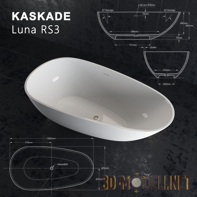 3D-модель стильной каменной ванны Kaskade Luna. Артикул RSA3-1680, страна-производитель - Австралия. Эта ванна сочетает в себе стиль и качество. Естественный вид камня, стильный и современный дизайн ванны Kaskade Luna превратит любую ванную комнату в теплое и очень расслабляющее пространство.