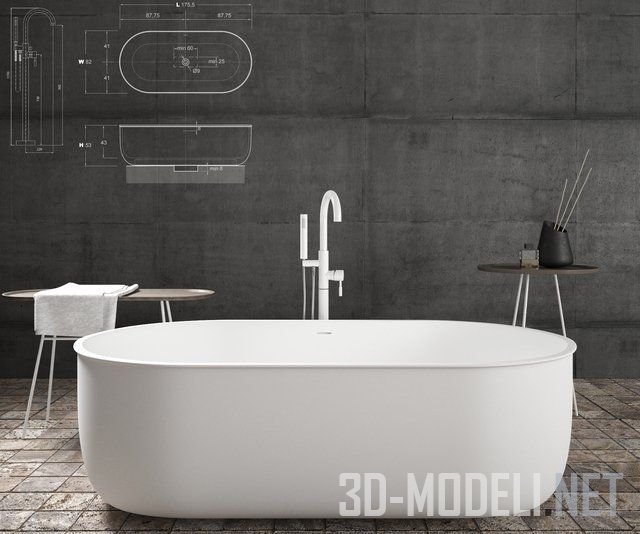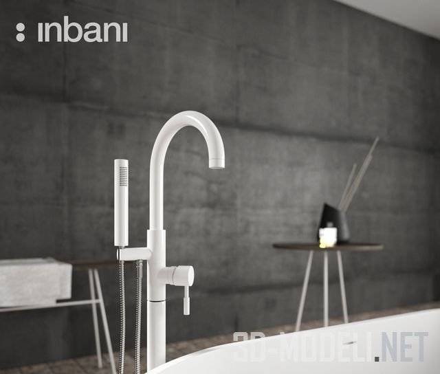 Современная овальная отдельностоящая ванна Prime с белым напольным смесителем Me от inbani. В смесителе, кроме излива предусмотрен душ на гибком шланге, с небольшой лейкой.